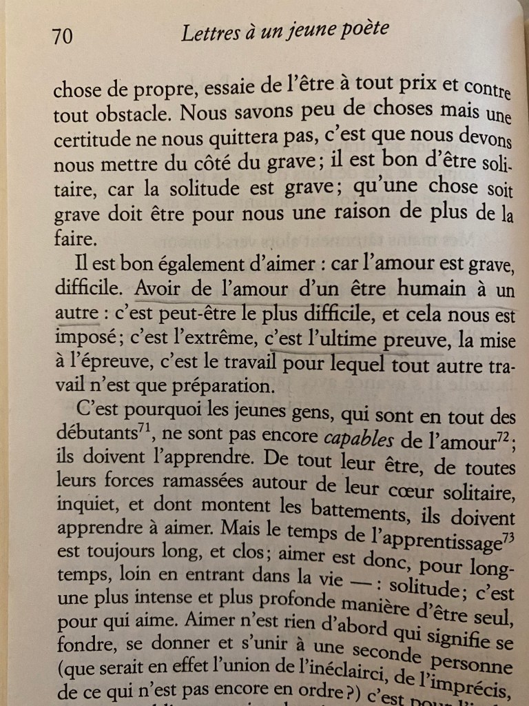 Sa réflexion sur l’amour, où il en parle avec beaucoup de finesse, me fait beaucoup penser à Nietzsche et à son évaluation exigeante sur l’art d’aimer et d’être aimé. Mais le thème dominant dans ces lettres est la solitude que l’on peut rapprocher à l’introspection de l’être (ou de l’artiste). D’ailleurs, il en parle positivement et éloigne toute circonspection à cet égard !
